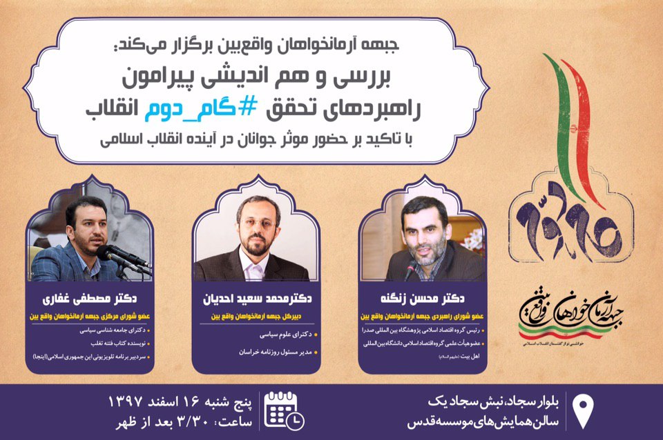 وی افزود: در همین راستا اولین جلسه هم اندیشی جوانان مومن انقلابی پیرامون مسائل، اهداف و راهبردهای تحقق بیانیه گام دوم انقلاب پنجشنبه 16 اسفند ماه از ساعت 15:30 برگزار خواهد شد و در خدمت دکتر سعید احدیان، دکتر مصطفی غفاری و دکتر محسن زنگنه هستیم.