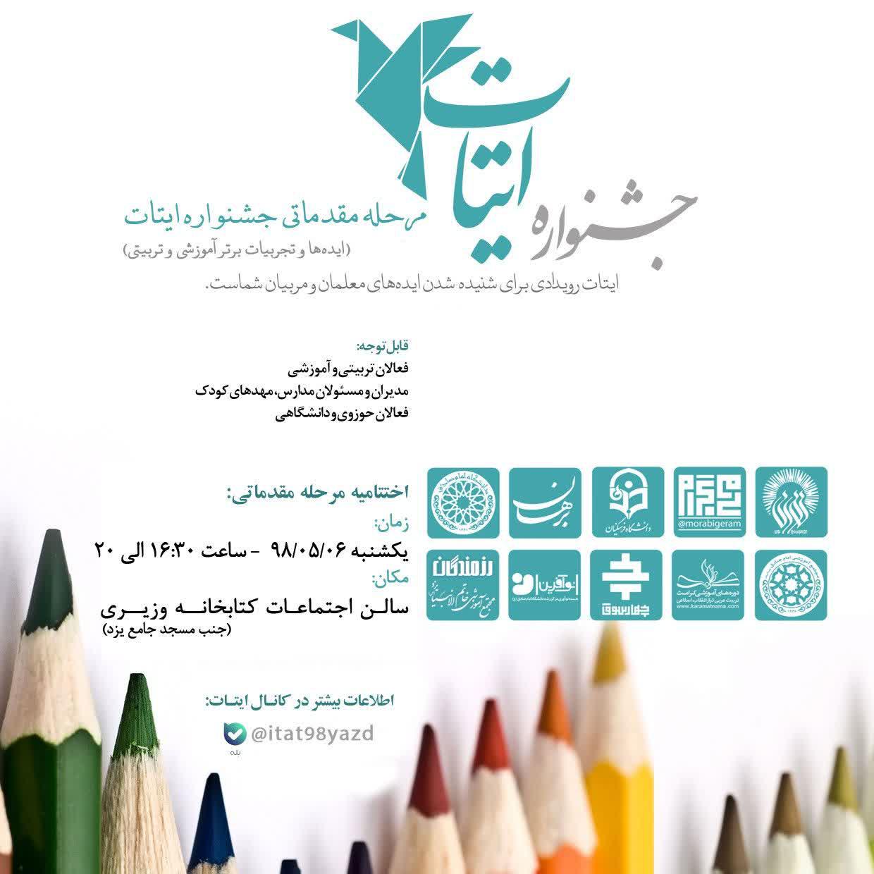 حلقه وصل: اختتامیه مرحله مقدماتی (استانی) جشنواره «ایتات» در یزد برگزار می شود. این جشنواره با محوریت ایده ها و تجربیات برتر آموزشی و تربیتی ویژه ی نخبگان، اساتید دانشگاه، مدیران مدارس، معلمین و آموزگاران، مشاوران، فرماندهان بسیج، مسئولین کانونهای مساجد، فعالین فرهنگی، روحانیون، مجموعههای تربیتی، مسئولین هیآت مذهبی و سایر کسانی که دغدغه ی انقلابی و رشد تربیتی و آموزشی نسل امروز و فردا را دارند برگزار می گردد.