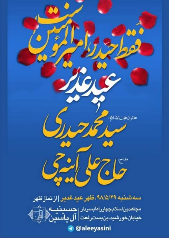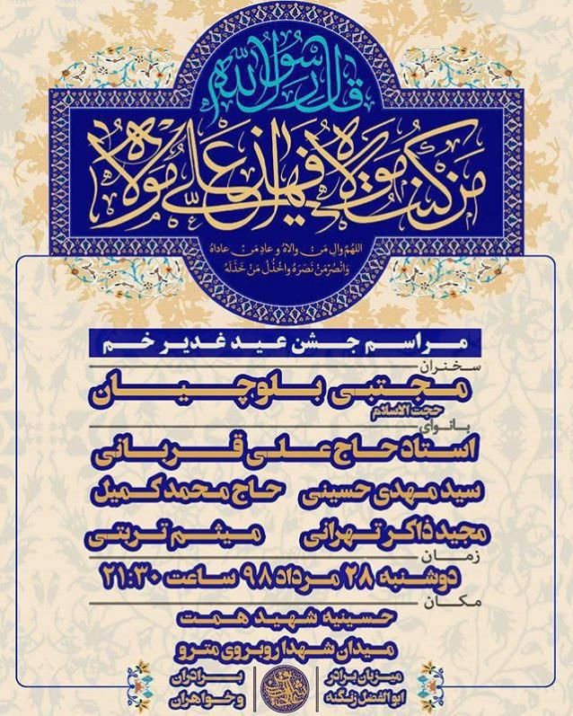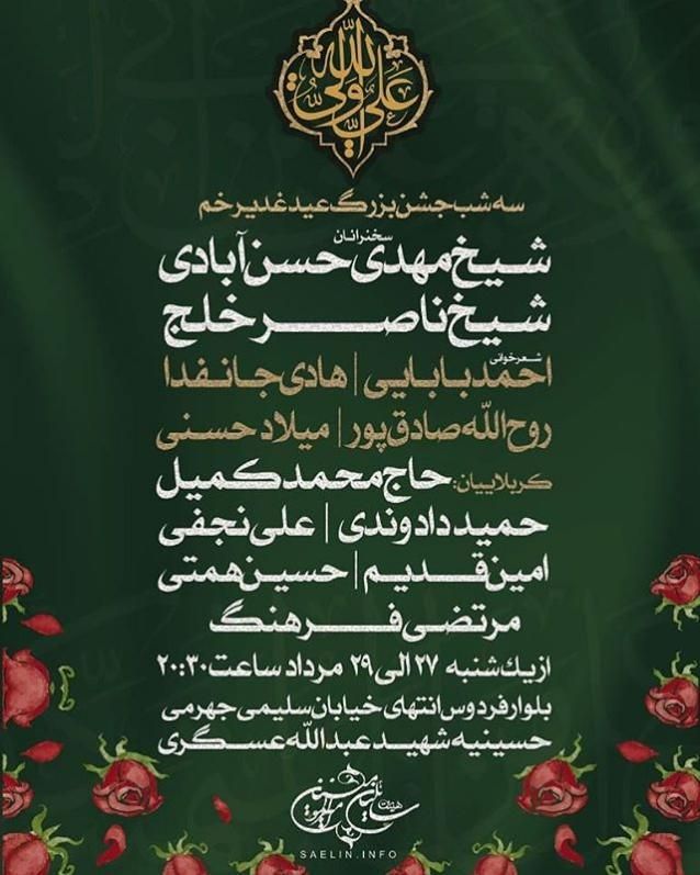 حلقه وصل برخی برنامههای هیئتهای مذهبی تهران را که در شب و روز عید غدیر اقدام به برپایی مراسم شادی و ذکر اهل بیت(ع) میکنند، جهت دسترسی بهتر و سریعتر مخاطبان منتشر میکند.